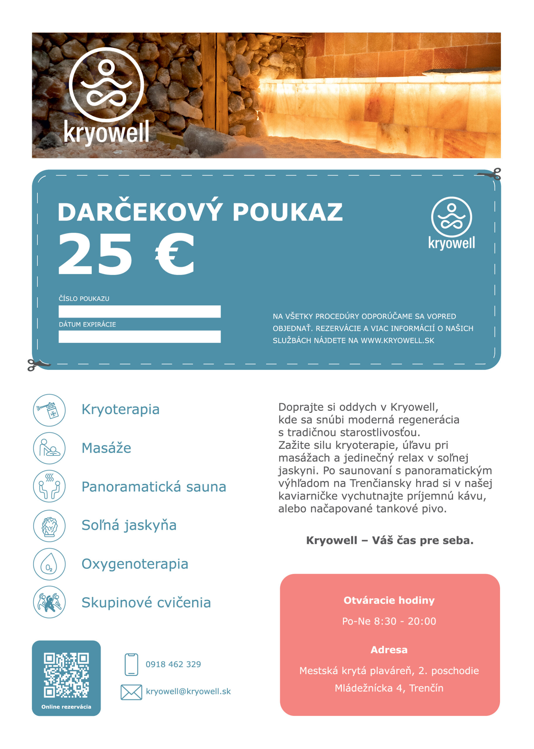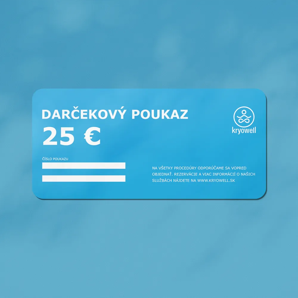 Darčekový poukaz v hodnote 25 € na služby Kryowell v Trenčíne. Ideálny darček pre každého, kto si chce dopriať masáž, kryoterapiu, saunu, soľnú jaskyňu alebo inú procedúru podľa vlastného výberu.